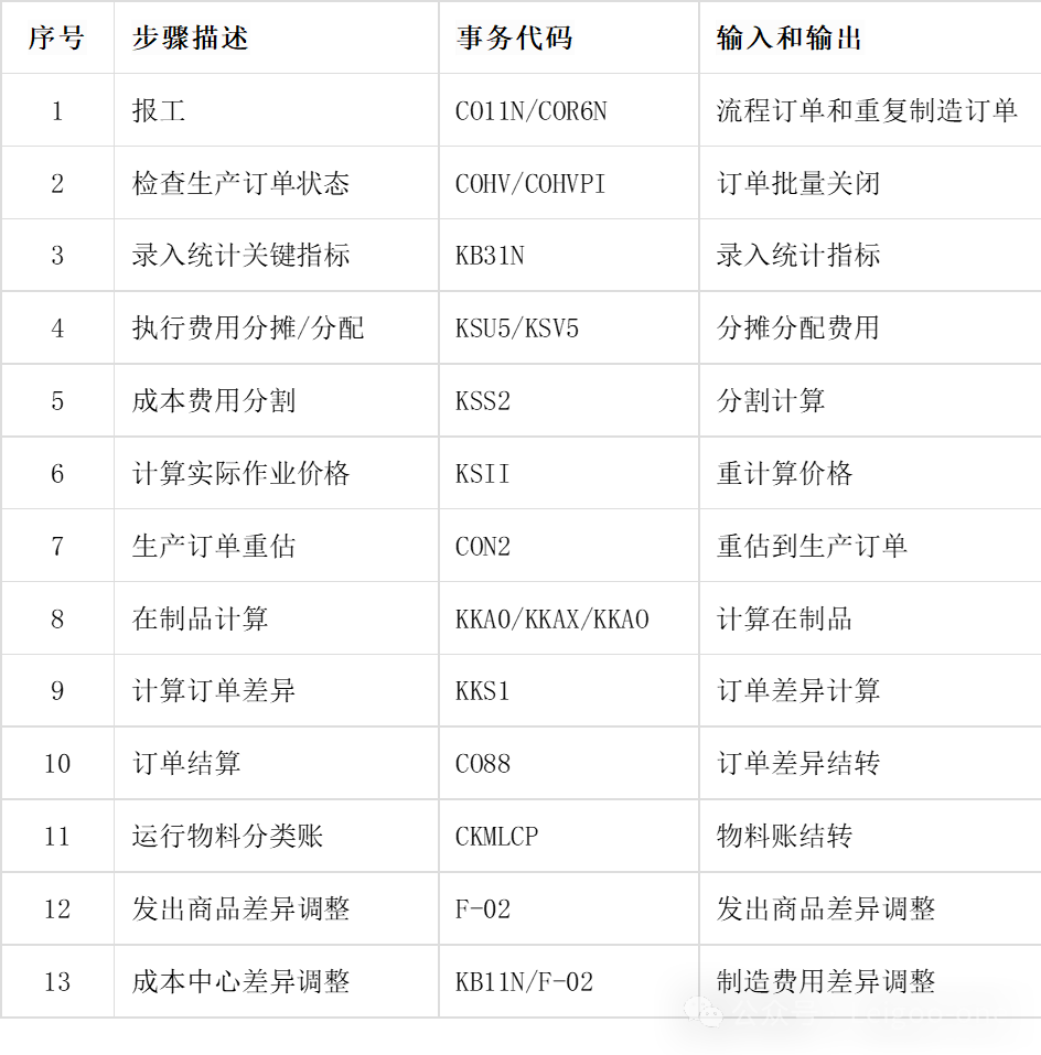 按實(shí)際價(jià)格重估訂單成本,CON2按實(shí)際價(jià)格重估。訂單報(bào)工時(shí)以計(jì)劃作業(yè)價(jià)格從成本中心結(jié)轉(zhuǎn)成本到訂單,月底得到成本中心實(shí)際費(fèi)用后,計(jì)算出實(shí)際作業(yè)價(jià)格,將作業(yè)成本差異調(diào)整到生產(chǎn)訂單上。執(zhí)行完CON2之后,需要檢查生產(chǎn)成本中心余額是否為0,如果不為0需分析原因,再進(jìn)行下一步操作。實(shí)際作業(yè)價(jià)格計(jì)算完成,按照實(shí)際報(bào)工量把實(shí)際作業(yè)成本計(jì)算重估到生產(chǎn)訂單,依此還原實(shí)際制造費(fèi)用,生成CO憑證。8、在制品計(jì)算