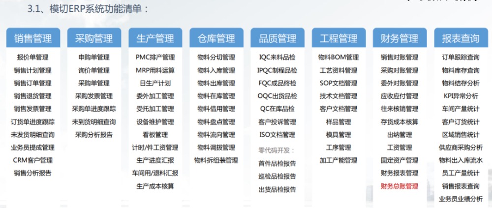 財(cái)務(wù)管理:包括總賬、應(yīng)收賬款、應(yīng)付賬款、現(xiàn)金管理、固定資產(chǎn)管理、成本會計(jì)和財(cái)務(wù)報(bào)告等。