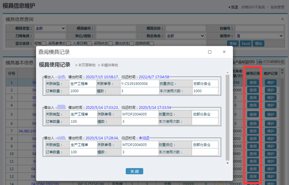 進(jìn)入點(diǎn)晴ERP系統(tǒng)-》工程管理-》模具(刀模)管理-》模具(刀模)管理,找到相應(yīng)的刀模編號,點(diǎn)擊后面的使用記錄,就可以看到詳細(xì)的使用記錄了: