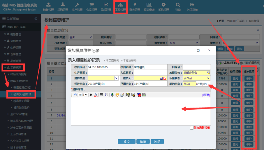 進(jìn)入點(diǎn)晴ERP系統(tǒng)-》工程管理-》模具(刀模)管理-》模具(刀模)管理,找到相應(yīng)的刀模編號,點(diǎn)擊后面的維護(hù)記錄,就可以錄入此刀模的維護(hù)記錄了: