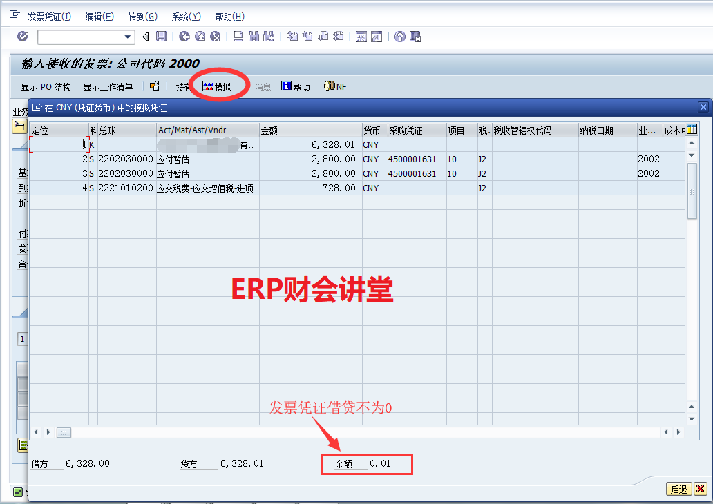 發(fā)票校驗是SAP采購流程中的重要環(huán)節(jié),收到供應(yīng)商發(fā)票之后,需要在SAP中匹配入庫記錄,并核對數(shù)量和金額是否正確,如有差異需要進一步確認原因,必要時將發(fā)票退回給供應(yīng)商。 ![]() SAP中發(fā)票校驗可以通過事務(wù)碼MIRO由財務(wù)一步處理,也可以先由業(yè)務(wù)預(yù)制發(fā)票(MIR7),然后財務(wù)審核過賬發(fā)票(MIR4)。本文以MIRO為例,介紹SAP中發(fā)票校驗的具體操作。 系統(tǒng)中有如下采購訂單,數(shù)量為500,訂單收貨3次,每次數(shù)量100,查看采購訂單歷史如下圖。當前收到供應(yīng)商發(fā)票,數(shù)量為200,接下來MIRO進行發(fā)票處理。 ![]() 第一步,匹配入庫憑證。 錄入發(fā)票日期,采購訂單號后回車,系統(tǒng)會自動帶出已入庫物料的數(shù)量及金額。系統(tǒng)默認選中所有未匹配發(fā)票的入庫憑證,如果記錄太多,可以將抬頭信息折疊。 在上圖界面中,根據(jù)發(fā)票數(shù)量匹配入庫憑證,然后點擊右下角的圖標C刪除未匹配的行。接下來校對發(fā)票的金額是否正確,如果有差異需要確認原因。確認無誤后錄入發(fā)票的總額及稅金(下圖)。 ![]() 第二步,核對付款條件等信息。在“支付款項”頁中核對付款條件、付款方式等信息。通常這些信息由供應(yīng)商主數(shù)據(jù)中帶過來,可以根據(jù)每次的實際情況進行調(diào)整。 ![]() 第三步,模擬發(fā)票。 點擊紅圈中的按鈕,可以模擬發(fā)票憑證,檢查是否存在錯誤。關(guān)閉模擬窗口后,如果“消息”處顯示紅色表示有錯誤,點擊“消息”查看具體的錯誤原因。 上圖錯誤原因為發(fā)票的借/貸余額不為0,系統(tǒng)沒有找到記錄差異的科目。更改發(fā)票金額使借/貸余額相等,再次模擬,“消息”處不再提示錯誤。 點擊保存按鈕生成系統(tǒng)發(fā)票憑證。MIR4查看發(fā)票憑證如下圖, 點擊“后繼憑證”查看會計憑證如下, 接下來,ME23N再次查看采購訂單歷史如下, 訂單的入庫數(shù)量為300,發(fā)票數(shù)量為200。并且再次對訂單錄入發(fā)票時,已經(jīng)匹配發(fā)票的入庫憑證默認未選中,可以直接點擊右下角的圖標刪除項目。并且,通過后臺配置,可以實現(xiàn)一張物料憑證只能匹配一次發(fā)票,防止重復(fù)的發(fā)票校驗。 以上,為發(fā)票校驗的詳細手冊,也是最簡單的一種情況,實際業(yè)務(wù)中還會有紅字發(fā)票、發(fā)票差異等情況。 點晴模切ERP更多信息:http://moqie.clicksun.cn,聯(lián)系電話:4001861886 該文章在 2024/6/28 11:12:53 編輯過 |