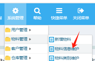 操作步驟,系統(tǒng)管理-物料管理-物料信息維護(hù),如下圖:
