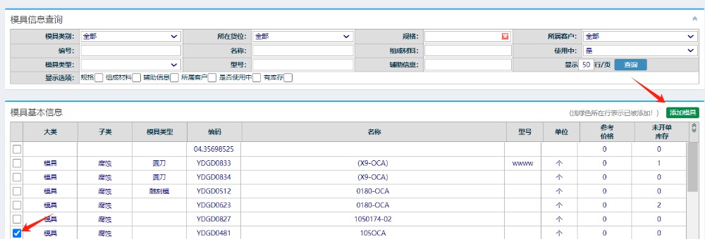 選擇指定的模具編碼,點(diǎn)擊添加模具按鈕,如下圖: