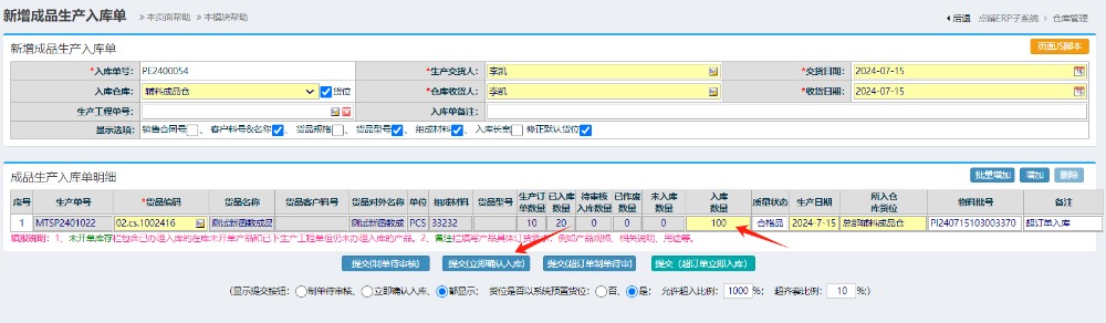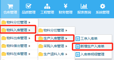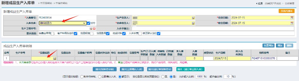 操作步驟:倉庫管理-物料入庫管理-生產(chǎn)入庫管理-新增生產(chǎn)入庫單,如下圖所示: 進(jìn)入界面后,選擇對應(yīng)的入庫倉位,再點擊明細(xì)欄的物料編碼欄位,如下圖所示: