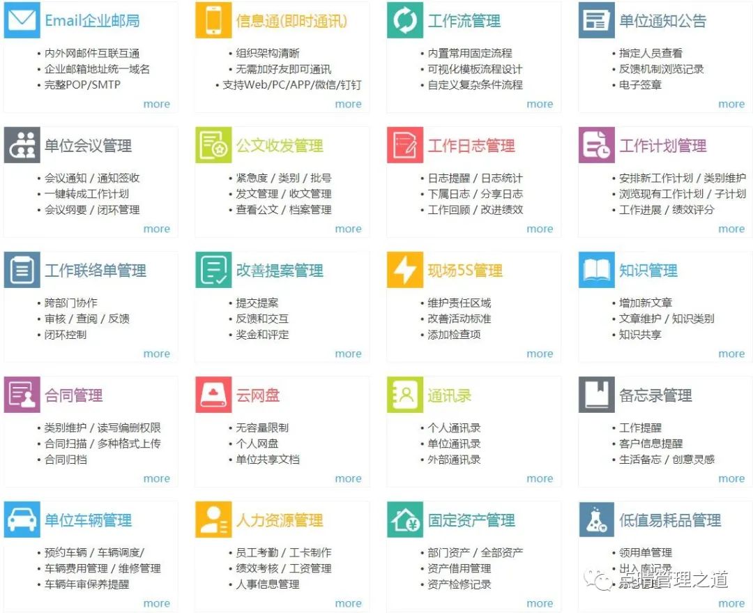 1、流程審批:表單制作、流程設(shè)計(jì)、審批處理、工作催辦、審批統(tǒng)計(jì)。2、行政綜合:包含“公告管理”、“新聞管理”、“單位會(huì)議”、“工作聯(lián)絡(luò)單”、“改善提案”等模塊。3、電子郵件:內(nèi)部郵件、POP3郵件收發(fā),郵件管理。4、文檔中心:網(wǎng)盤(pán)的建立與權(quán)限分配,文件上傳與管理。5、部門(mén)計(jì)劃:部門(mén)周計(jì)劃、月計(jì)劃的起草、審核、發(fā)布、匯總等。6、任務(wù)安排:工作任務(wù)下達(dá)、執(zhí)行、轉(zhuǎn)發(fā),任務(wù)執(zhí)行進(jìn)度監(jiān)控。7、工作報(bào)告:撰寫(xiě)工作總結(jié)、匯報(bào),可提交上級(jí)審閱。8、個(gè)人辦公:管理個(gè)人工作日程安排及建立個(gè)人聯(lián)絡(luò)系統(tǒng)等。9、知識(shí)管理:知識(shí)文檔的分類(lèi),知識(shí)的建立與查詢(xún)。10、會(huì)議管理:會(huì)議的計(jì)劃安排登記,會(huì)議紀(jì)要管理,會(huì)議查詢(xún)管理。11、車(chē)輛管理:車(chē)輛資料記錄、車(chē)輛使用管理、用車(chē)申請(qǐng)管理。12、用品管理:用品分類(lèi)登記,入庫(kù)、領(lǐng)用管理,統(tǒng)計(jì)報(bào)表。13、資產(chǎn)管理:資產(chǎn)分類(lèi)及資產(chǎn)登記,資產(chǎn)使用、歸還、維修、清理、管理。14、合同管理:企業(yè)合同的錄入、借閱、終止及查詢(xún)管理。16、常用工具:常用公共信息的管理與查詢(xún)。