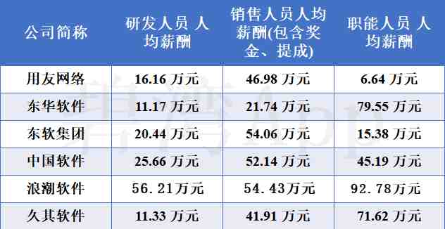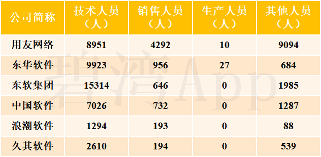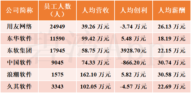 根據(jù)東華軟件(002065)、久其軟件(002279)、中國(guó)軟件(600536)、用友網(wǎng)絡(luò)(600588)、東軟集團(tuán)(600718)、浪潮軟件(600756)公開(kāi)披露數(shù)據(jù),對(duì)國(guó)產(chǎn)軟件行業(yè)6家公司的營(yíng)收、人員效率等數(shù)據(jù)統(tǒng)計(jì)如下(本文中的員工薪酬包含福利以及五險(xiǎn)一金):