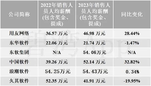 浪潮軟件是2023年研發(fā)人員人均薪酬最高的公司,為56.21 萬(wàn)元。與其相對(duì)的,研發(fā)人員人均薪酬最低的公司是東華軟件,只有11.17 萬(wàn)元。除此之外,銷售人員人均薪酬最高的是東軟集團(tuán),其銷售人員人均薪酬比研發(fā)人員高33.61 萬(wàn)元。