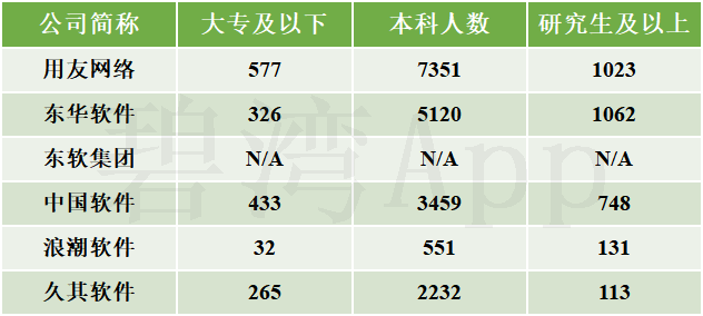 用友網(wǎng)絡(luò)是研發(fā)人數(shù)最多的的公司,東華軟件是高學(xué)歷人數(shù)最多的的公司,是總研發(fā)人數(shù)的16.32%,研發(fā)實(shí)力強(qiáng)勁。東軟集團(tuán)是大專及以下人數(shù)占比最高的公司,占總研發(fā)人數(shù)的100.00%,與其相反,浪潮軟件是大專及以下人數(shù)占比最低的公司,研發(fā)人員以本科及以上學(xué)歷為主體,展現(xiàn)出強(qiáng)勁的研發(fā)實(shí)力。