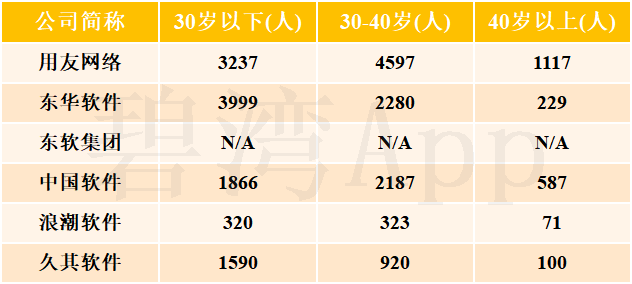 東華軟件是30歲以下員工最多的公司,為3999人,占總研發(fā)人數(shù)的61.45%,與其相對(duì)的,東軟集團(tuán)是40歲以上人數(shù)最多的公司,為3602人,占總研發(fā)人數(shù)的100.00%。