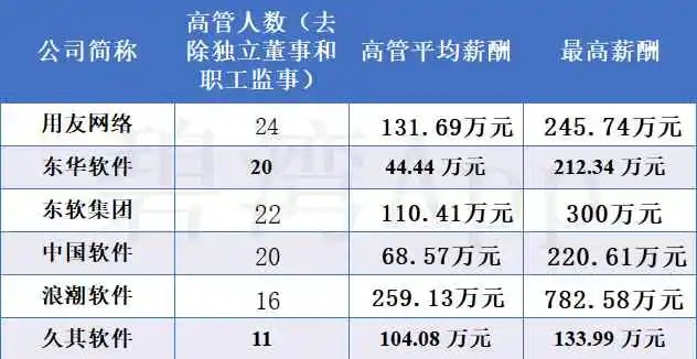 高管平均薪酬最高的是久其軟件,為104.08 萬(wàn)元。和他相反,東華軟件是2023年高管平均薪酬最少的的公司,為44.44 萬(wàn)元。