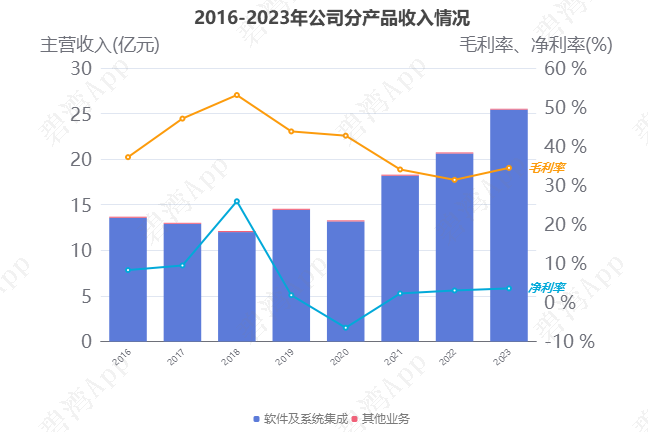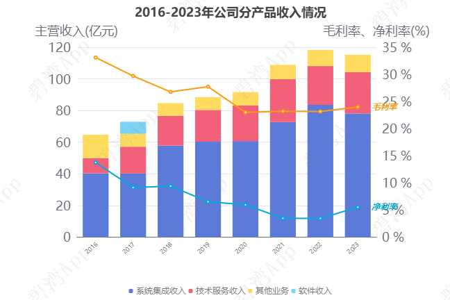 2023年公司的主要業(yè)務(wù)為金融健康行業(yè),占比高達(dá)62.47%,主要產(chǎn)品包括系統(tǒng)集成收入和技術(shù)服務(wù)收入兩項(xiàng),其中系統(tǒng)集成收入占比67.81%,技術(shù)服務(wù)收入占比22.62%。