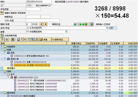 簡單的說就是按照累計庫存與消耗之比分攤差異。 生產(chǎn)訂單共消耗該物料3268件,當期累計庫存為8998件,總差異為150,計算公式為: 當期消耗 / 累計庫存×總差異 = 消耗承擔的差異 按實際成本分攤差異