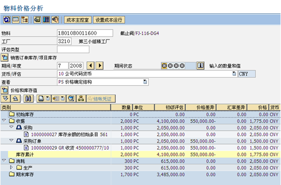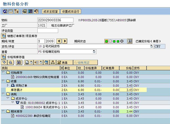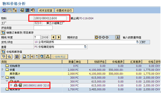 這里顯示1804170001160這個物料的價格被修改,系統(tǒng)會根據(jù)新舊兩個價格自動算出庫存價值差異。同時,我們可以在CKM3中對這個物料的價格進行詳細的分析,CKM3界面如下所示:
