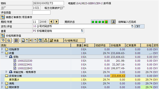 該物料入庫數(shù)量為1,但總差異達23萬。原因是該物料是一個按單的物料,物料分類帳能夠區(qū)分按單物料和非按單物料的差異。該物料按照訂單收貨,在發(fā)票校驗時,產(chǎn)生了一筆23W的采購差異,但該物料并沒有按照訂單進行校驗,從而,按單的發(fā)票校驗的差異,直接進入該物料非按單的庫存中,直接導(dǎo)致該物料非按單庫存的實際價格異常。