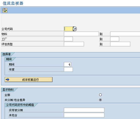 分析物料實際成本 在完成第六步后,建議使用值流監(jiān)視器,事務(wù)代碼:CKMVFM,如下圖所示,對物料實際成本數(shù)據(jù)進行分析、核對,如果發(fā)現(xiàn)差異異常的物料,可以在正式差異過賬前對后勤業(yè)務(wù)進行調(diào)整。調(diào)整完畢后,按照調(diào)整內(nèi)容,如果涉及成本中心或生產(chǎn)訂單,則可以考慮對生產(chǎn)訂單重新結(jié)算。如果涉及面不廣,則僅需對物料分類帳重新結(jié)算。調(diào)整完畢后,再進入到第七步。