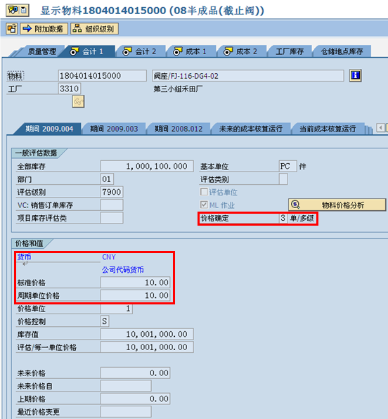 物料主數(shù)據(jù)的變化: 下面是啟用物料分類帳后,物料的會計1視圖: 從上圖我們可以看到,物料除了標準價外,還多了一個周期單位價格。這個價格類似于移動平均價,不同之處是,這個價格僅在一個周期內(nèi)有效,我們可以簡單的理解為,這是物料在某個期間內(nèi),計算得出的移動平均價。