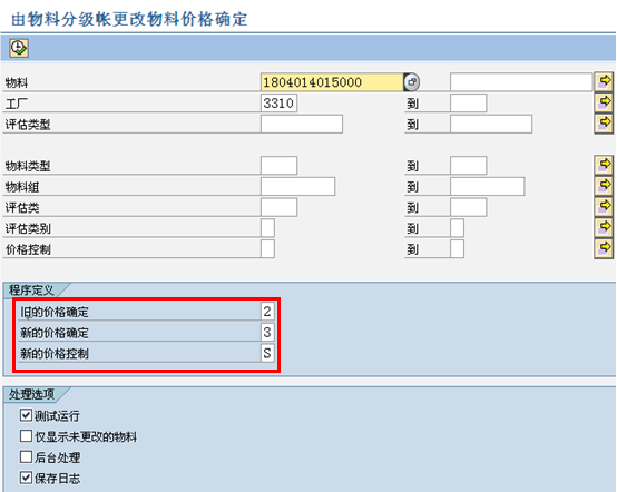 價格確定字段用來控制物料的價格類型,為S還是V。當價格確定為2時,物料可以使用V或者S作為計價方式;當價格確定為3時,物料只能使用S標準價作為計價方式。價格確定由后臺配置確定,在啟動工廠時,自動默認至物料主數(shù)據(jù)中。在物料發(fā)生業(yè)務(wù)之前,可以使用CKMM進行批量更改。如下圖所示: