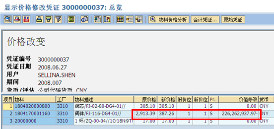 從上圖我們可以看到,有兩張物料分類帳憑證,第一帳時傳統(tǒng)的物料交易憑證,第二張為物料價格變動憑證,如下圖所示: