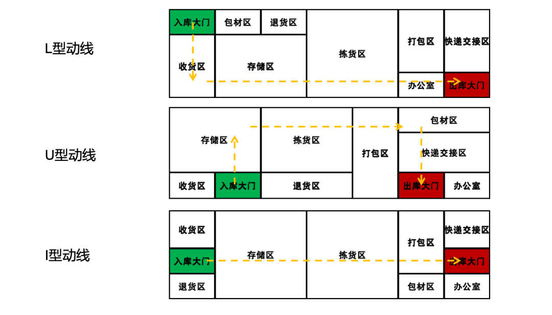 倉庫主動線的設(shè)計是整個倉儲物流中心運行的基礎(chǔ),實操中常使用的倉庫動線有以下三種類型: 1、L型動線 可以應(yīng)對進出貨高峰同時發(fā)生的情況;適合越庫作業(yè)的進行;可同時處理“快流”及“慢流”的貨物。 2、U型動線 出入口在倉庫的同側(cè),根據(jù)進出貨頻率大小,將流量大的商品安排在靠近進出口端的存儲區(qū),縮短商品的揀貨搬運路線。 3、I型動線 出入口在倉庫的相對面,無論訂單大小與揀貨品相多少,均要通過倉庫全程,適合作業(yè)流程簡單、規(guī)模較小的作業(yè)。