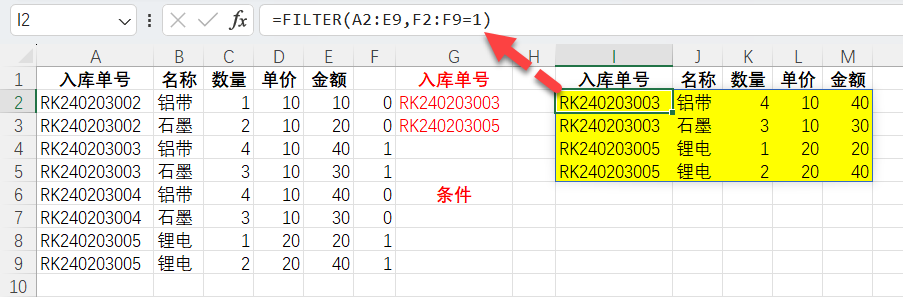 前2天的文章,提到用FILTER函數(shù)可以根據(jù)入庫單號將符合條件的內(nèi)容引用出來。不過這個公式,只能針對1個入庫單號,不允許多個入庫單號。