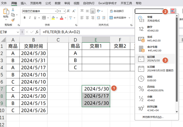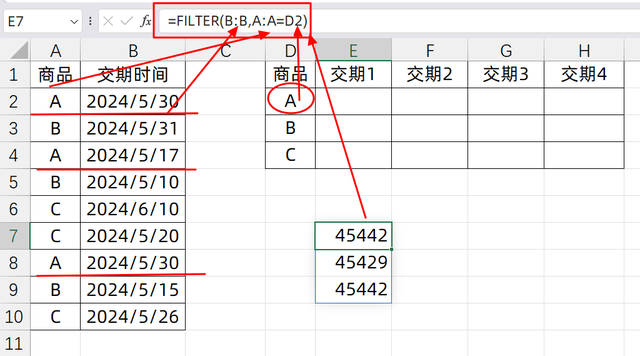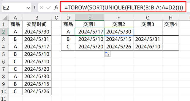 如果說我們要去重,顯示交期結(jié)果呢? 其實很簡單,只需要在FILTER公式外面套一個UNIQUE就可以了,它可以對去除重復(fù)的數(shù)據(jù),只保留唯一值,所以我們輸入的公式是: =TOROW(UNIQUE(FILTER(B:B,A:A=D2)))