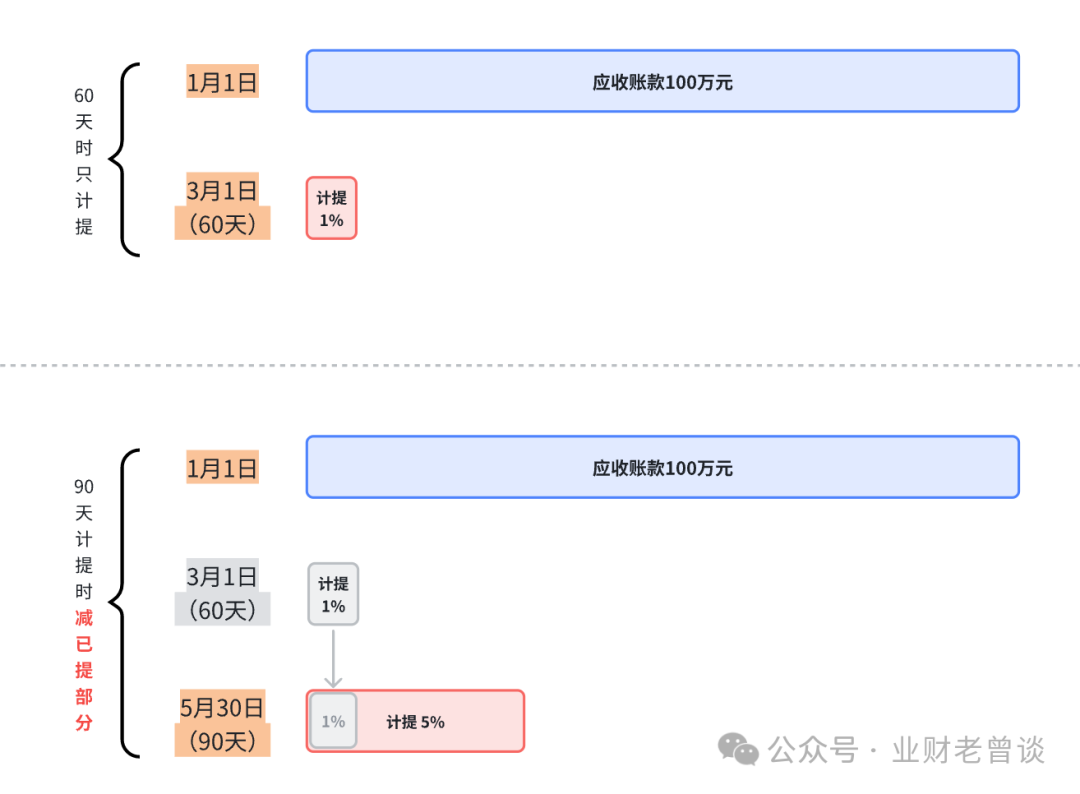 - 比如:甲公司2023年1月1日新增一筆應(yīng)收賬款計(jì)10萬(wàn)元,客戶為乙公司,到3月1日賬齡為60天,到5月30日賬齡為90天,如果公司的壞賬計(jì)提標(biāo)準(zhǔn)為“滿60天計(jì)提1%,90天計(jì)提5%,180天計(jì)提15%,360天計(jì)提30%”,那在60天時(shí)計(jì)提1%,在90天時(shí)計(jì)提5%同時(shí)要沖銷60天計(jì)提的1%,否則計(jì)提多了。