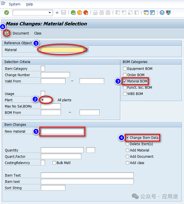 輸入舊的組件物料編碼(見(jiàn)①),輸入工廠編碼(見(jiàn)②),輸入星號(hào)代指所有工廠,選擇BOM類型(見(jiàn)③),選擇具體操作(見(jiàn)④,一定是選擇Change Item Data),輸入替換后的新組件物料編碼(見(jiàn)⑤),點(diǎn)擊運(yùn)行(見(jiàn)⑥,快捷鍵F8)。