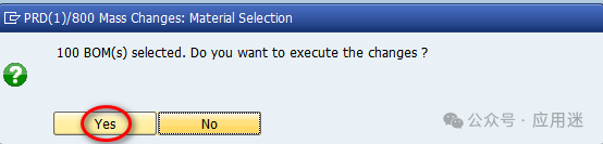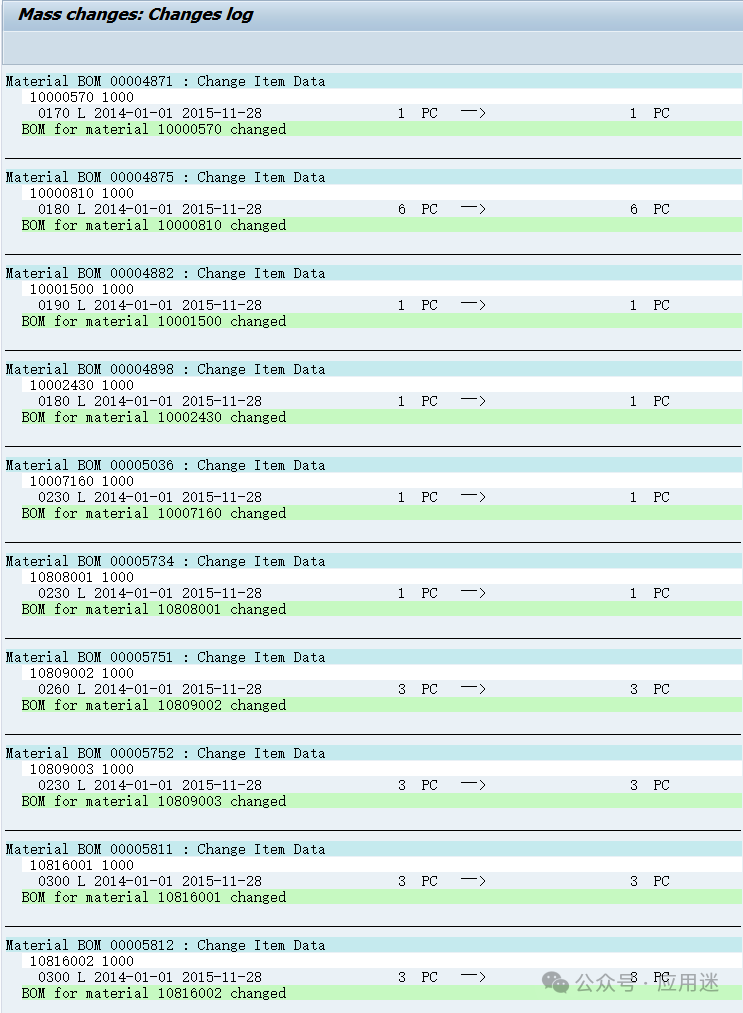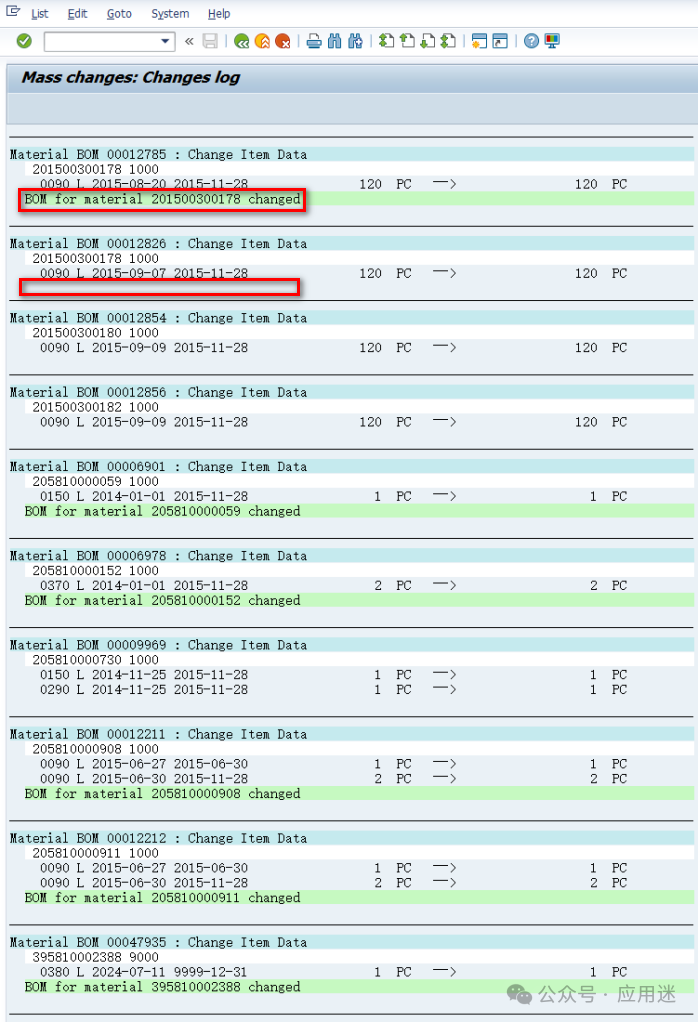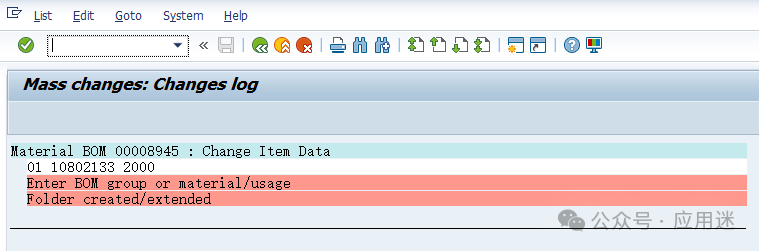 批量替換完畢后會(huì)顯示如下日志,有些會(huì)顯示BOM for material XXXXXXXXXXXX changed,有些顯示為空,大家知道是為什么嗎?可以在文章下方留言討論,期待大家的回音。