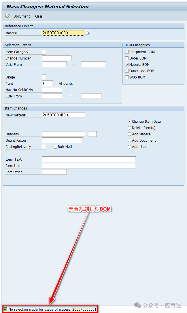 批量更改失敗的會(huì)碰到下面這種情況,說(shuō)明BOM group或者material/usage不存在,無(wú)法替換。