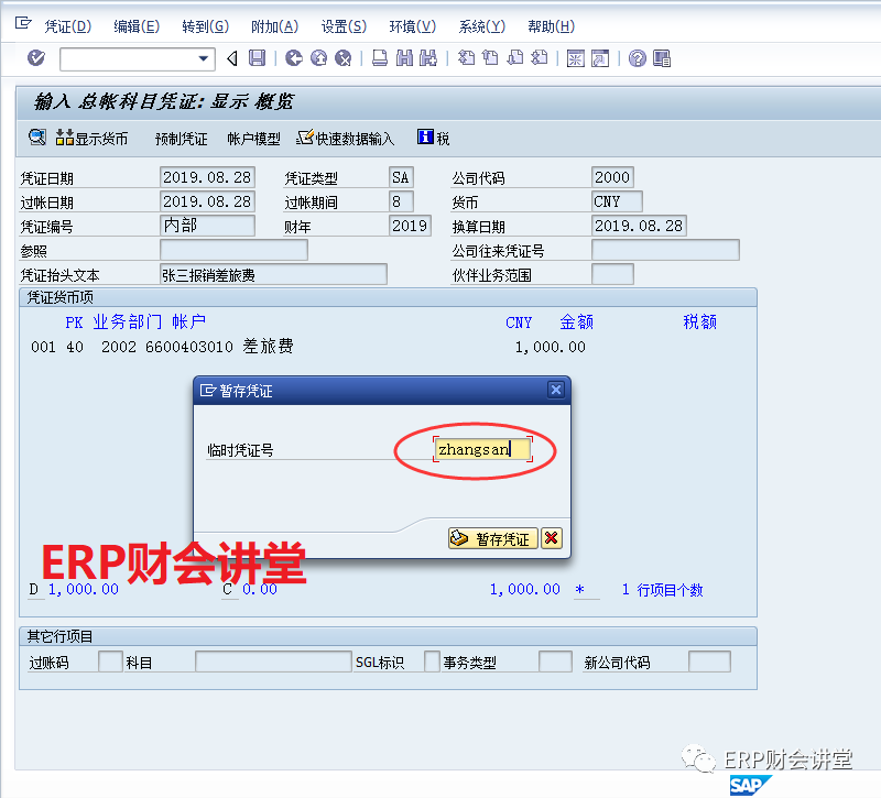 大家在SAP中錄入憑證時(shí),可能會(huì)遇見這種情況,憑證錄入到一半時(shí),領(lǐng)導(dǎo)臨時(shí)交代重要任務(wù),回來的時(shí)候SAP已經(jīng)斷掉了,不得不重新錄入憑證。有的朋友可能會(huì)問,SAP中是否可以臨時(shí)保存憑證呢?這當(dāng)然可以,今天要給大家介紹的就是SAP的憑證暫存功能。例如,張三來報(bào)銷費(fèi)用,剛錄完借方分錄,如下圖,