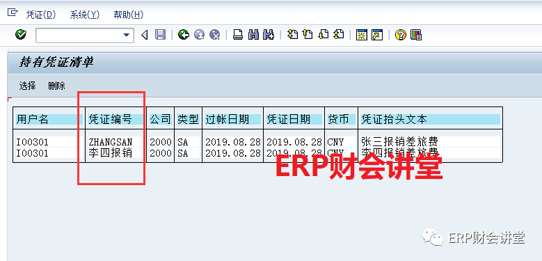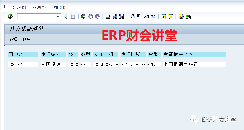 此時(shí),再次去查看暫存憑證,可以發(fā)現(xiàn)張三報(bào)銷費(fèi)用的暫存憑證已經(jīng)不在了,因?yàn)闀捍娴膽{證已經(jīng)錄入完成,系統(tǒng)自動(dòng)給刪掉了。