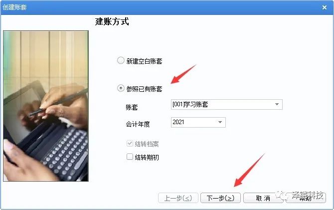 (二)如果是需要建立和其他賬套檔案完全一致,那么可以選擇參照已有賬套建賬,勾選結(jié)轉(zhuǎn)檔案。