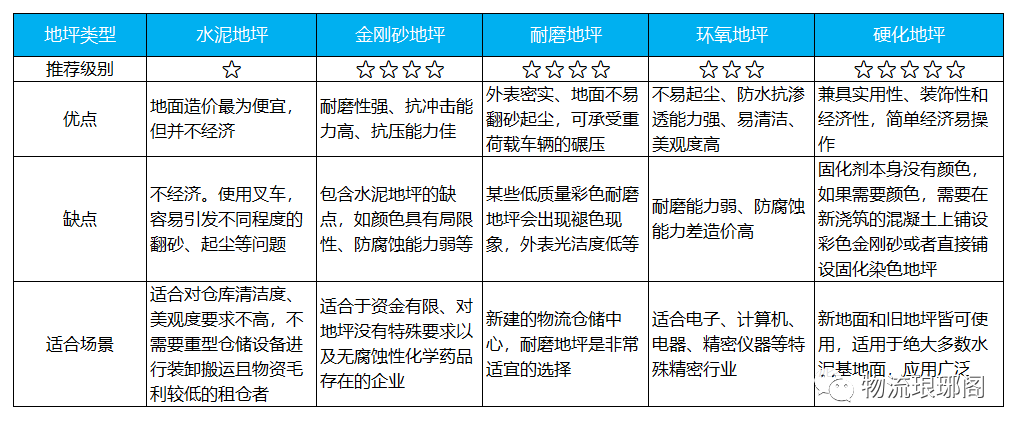“倉庫地坪能否匹配倉庫需求,對未來的倉庫規(guī)劃設(shè)計及運作都影響很大。如何進行選擇?” 倉庫地坪類型 倉庫選倉過程中一般會遇到哪些地坪類型呢?它們有什么區(qū)別,如何選擇呢? 接下來小編將帶你一起探討5種倉庫常用的地坪方案。具體如下: 01 水泥地坪 定義:水泥地坪一般采用C20以上強度,15~20cm厚的素混凝土直接收光做面層,或在混凝土墊層上做3~5cm厚,C30以上強度的水泥砂漿罩面層。 優(yōu)點:成本低,平整度高,抗壓。 缺點:不耐磨,易老化,易起灰塵,脫砂;耐腐蝕、抗紫外線能力弱;易風(fēng)化。 租倉建議:便宜但不經(jīng)濟 目前水泥地坪類型是倉庫中最便宜的地坪類型,但是不是最經(jīng)濟的地坪類型。 一般使用兩年后,在叉車頻繁作業(yè)下,水泥地坪會出現(xiàn)不同程度的起塵、起砂問題。 隨著倉庫使用年限的延長,加上碳化、水侵蝕和風(fēng)化的作用,地面粉化是常態(tài)。這將加大了倉庫物資清潔難度,影響倉庫的正常運行。 適用場景:水泥地坪倉庫比較適合對倉庫清潔度、美觀度要求不高,不需要重型倉儲設(shè)備進行裝卸搬運,且物資毛利較低的企業(yè)。 02 金剛砂地坪 定義:金剛砂地坪屬于耐磨地坪的一個細(xì)分種類,目前倉庫中使用金剛砂地坪十分普遍。 優(yōu)點:表面密實;耐磨性能、抗沖擊性能、抗壓性能極佳;易清潔;無污染環(huán)保。 缺點: 1)某些低質(zhì)量彩色金剛砂地坪短時間內(nèi)會掉色,比如綠色; 2)顏色選擇有一定的局限性:水泥原色、灰色、綠色、紅色; 3)表面光潔度遠(yuǎn)不及環(huán)氧地坪,尤其是質(zhì)量較差的金剛砂地坪使用1年以上就可能起灰; 4)不能抵抗化學(xué)藥品的腐蝕; 5)滲透性欠佳,若庫區(qū)常有油污,則油污容易滲透地坪內(nèi)部,難以清潔。 租倉建議:“紅人”金剛砂地坪,最普遍應(yīng)用 金剛砂地坪可以滿足車輛頻繁行走、經(jīng)常有重物撞擊、經(jīng)常有尖銳硬化磨擦、無腐蝕性化學(xué)藥品存在、對潔凈度要求不高、對美觀度要求不高的各類企業(yè)。 適用場景:金剛砂一般使用年限5-10年,好的可以達(dá)到10-20年,質(zhì)量較差的在5年以內(nèi)。一般適合于資金有限、對地坪沒有特殊要求以及無腐蝕性化學(xué)藥品存在的企業(yè)。 03 耐磨地坪 定義:耐磨地坪是在新澆筑水泥混凝土(水泥)并攤鋪平整的表面,均勻撒布一層耐磨地坪材料(石英砂、金剛砂、金屬、合金),運用專業(yè)的抹光機進行提漿和收光作業(yè)。 利用基層混凝土(水泥)的漿將耐磨材料潤濕后與基層混凝土(水泥)形成一個整體,并在表面形成一個防滑耐磨面層。 優(yōu)點: 1)耐磨性能強; 2)耐沖擊,以承受重荷載車輛的碾壓; 3)防塵,外表密實、地面不易翻砂起塵。 缺點: 1)外表光潔度低; 2)不能反抗化學(xué)腐蝕,尤其是酸、堿;防潮濕性能差; 3)施工需要與混凝土澆筑同步,一般更適用于新地面建設(shè);施工于舊地面時,需要另鋪5公分以上的細(xì)石混凝土層,造價通常較高。 租倉建議:經(jīng)濟性、耐用性中的佼佼者 1)新建的物流倉儲中心,耐磨地坪是非常適宜的選擇。 2)耐磨地坪的經(jīng)濟性、耐用性是所有地面形式中的佼佼者,無論是庫區(qū)還是站臺都可以使用。 3)耐磨地坪壽命一般在十年以上,最多可達(dá)20-30年,算下來成本較低。 適用場景: 1)適用存儲物資較重且需要運用重型倉儲機械或車輛進行頻繁作業(yè),對倉庫清潔度要求高的租倉者; 2)如果為金屬耐磨地坪時,不適用存儲潮濕、接觸酸性、結(jié)晶鹽及其它化學(xué)溶劑的物資的租倉者。 04 環(huán)氧地坪 定義:環(huán)氧地坪是一種高性能、耐磨、美觀的地面裝飾材料,其主要成分為環(huán)氧樹脂和固化劑。 優(yōu)點: 1)完全不起塵; 2)不脫層、不開裂; 3)平整光潔度高; 4)防水、抗?jié)B透能力強; 5)清洗簡單; 6)色彩豐富,美觀度極佳。 缺點: 1)不能抵抗較重的地下潮氣; 2)抗劃傷性能較差; 3)不耐光,長時間接觸紫外線容易“粉化”、變色; 4)使用壽命短,一般1~3年就需要重新施工。 租倉建議:特殊行業(yè)需使用環(huán)氧地坪 環(huán)氧地坪適用于無特別頻繁車輛行走、無重物經(jīng)常撞擊、無尖銳硬物經(jīng)常摩擦、無強腐蝕性化學(xué)藥品存在,對倉庫清潔度要求高的租倉者。 適用場景:不同環(huán)氧地坪適用于不同行業(yè) 1)防靜電環(huán)氧地坪:適合電子、計算機、電器、精密儀器、編織服裝等行業(yè); 2)水性環(huán)氧地坪:適合有環(huán)保要求的企業(yè)或潮濕的倉庫; 3)防腐環(huán)氧地坪:適合電鍍、線路板、化妝品、醫(yī)藥、農(nóng)藥、化肥、飼料等行業(yè),等等。 05 硬化地坪 定義:硬化地坪是由水晶地坪液體硬化劑打造而成的,在硬化劑材料滲入地面后,能與地面完全融為一體,并反應(yīng)生成結(jié)晶。 優(yōu)點: 1)大幅度提升水泥基面的硬度、耐磨度和密實度; 2)兼具實用性、裝飾性和經(jīng)濟性,簡單經(jīng)濟易操作; 3)兼容性強,適用于絕大多數(shù)水泥基地面,可以進行舊地坪硬化改造; 4)具有耐磨、耐用、高硬度、防塵、抗?jié)B、易清潔等特性; 5)壽命長,使用壽命20?年以上,甚至與建筑物同期。 缺點:固化劑本身沒有顏色,如果需要顏色,需要在新澆筑的混凝土上鋪設(shè)彩色金剛砂或者直接鋪設(shè)固化染色地坪。 租倉建議:最青睞的地坪類型之一 更具經(jīng)濟性,與環(huán)氧、金剛砂等