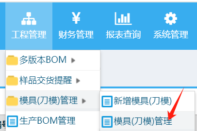 操作步驟:工程管理-模具(刀模)管理-模具(刀模)管理,如下圖: