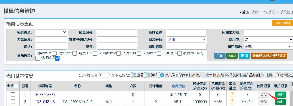 進(jìn)入界面后,篩選對應(yīng)的模具資料,點擊“維護(hù)”按鈕,如下圖: