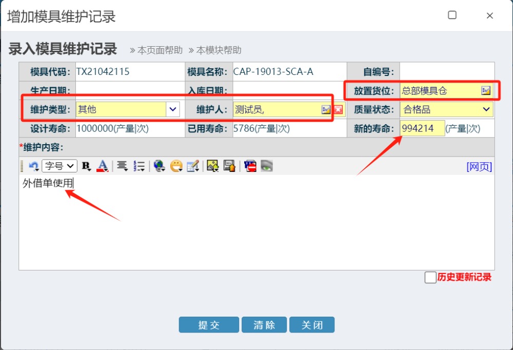 進(jìn)入界面后,登記維護(hù)類型,維護(hù)人,放置貨位,輸入新壽命,記錄維護(hù)類型等信息,點擊“提交”完成操作,如下圖所示: