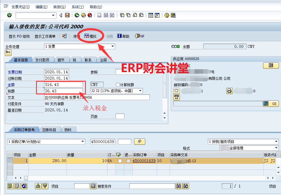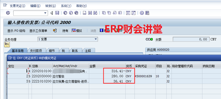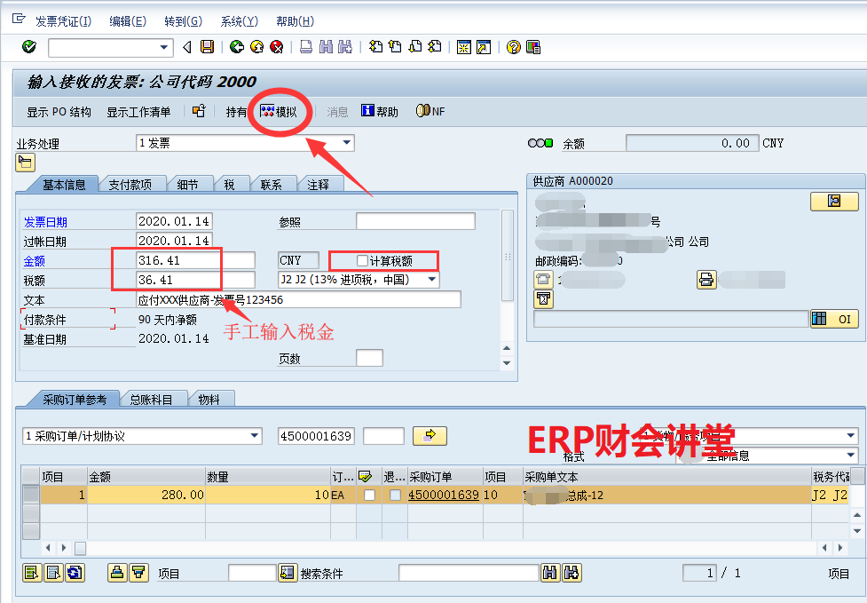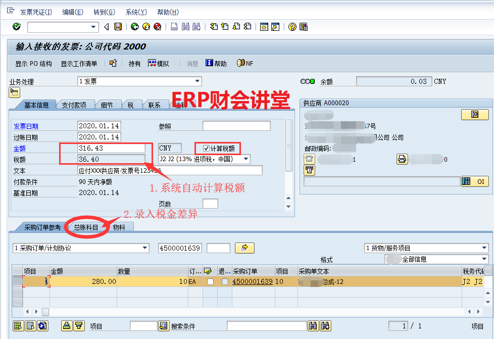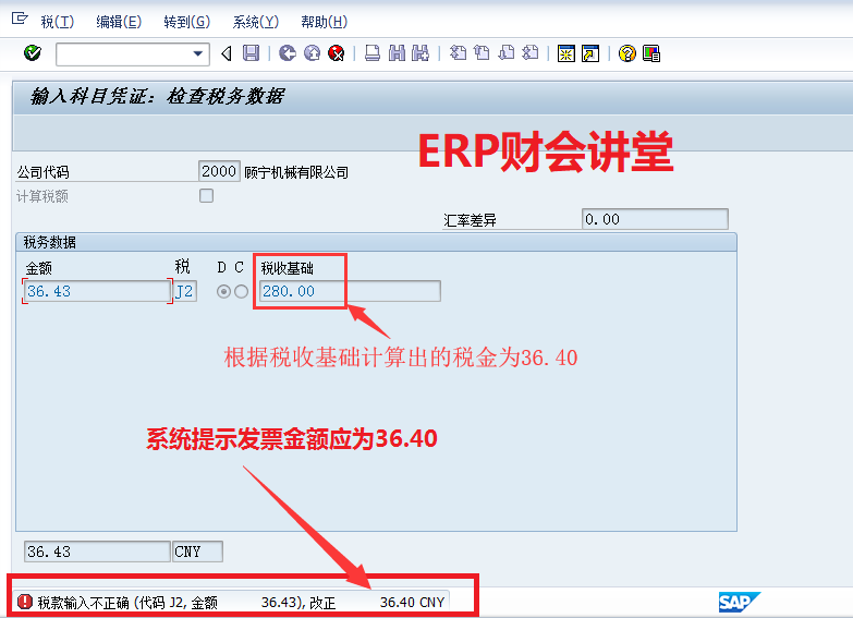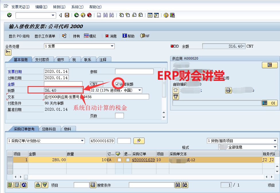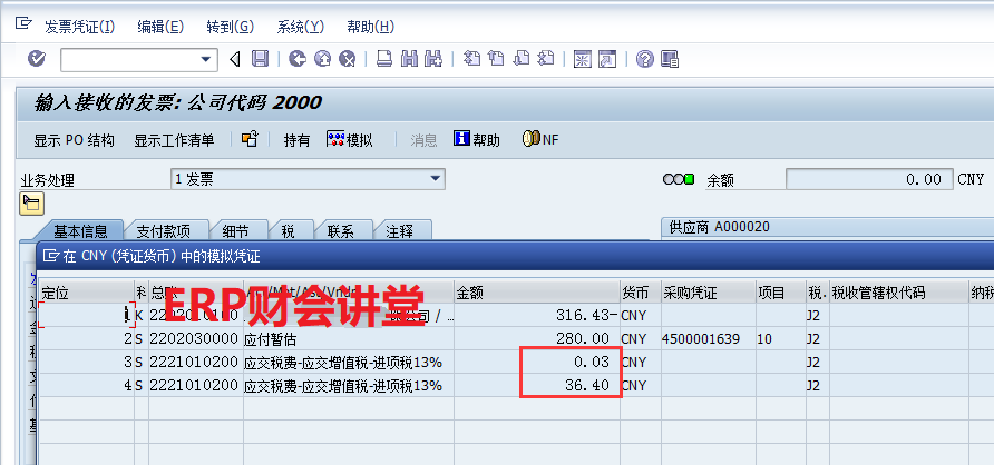 一般情況下,供應(yīng)商的開票金額與我們的入庫金額是一致的,不過有時也會出現(xiàn)不一致的情況,例如通過金稅系統(tǒng)開票出現(xiàn)尾差,或是開票價格大于訂單價格。本文介紹如何處理采購發(fā)票中的稅金差異。 采購訂單4500001639收貨金額為280.00(上圖)。MIRO錄入發(fā)票時,選中參考行后,系統(tǒng)計算的稅金為36.40(下圖),如果實際發(fā)票中稅金不是36.40該如何處理呢? 場景一:稅金差異較小,直接錄入稅金。例如發(fā)票金額為316.41,貨物凈值為280.00,稅金為36.41,這種情況下直接在“稅額”處錄入稅金即可。 錄入稅金后,選擇“模擬”,查看模擬憑證如下: 場景二:稅金差異較大,手工調(diào)整差異。例如發(fā)票金額為316.43,貨物凈值為280.00,稅金為36.43,這種情況下需要手工調(diào)整稅金。如果直接在“稅金”處錄入36.43,會有什么情況發(fā)生呢? 如上圖,錄入發(fā)票金額和稅金后,選擇“模擬”,系統(tǒng)提示如下錯誤。 根據(jù)稅收基礎(chǔ)280.00,乘以13%的稅率,系統(tǒng)計算出的稅金為36.40,實際錄入的稅金為36.43,相差0.03。事實上,SAP會根據(jù)發(fā)票凈值,結(jié)合稅率,校驗錄入的稅金,當(dāng)差異較大時不允許過賬。此時該如何處理呢? 由于稅金是和稅務(wù)相關(guān),要保持賬證一致,不能在稅金和貨物凈值之間調(diào)整差異,此時可以手工錄入稅金差異。 如上圖,首先讓SAP自動計算稅額36.40,然后點擊“總賬科目”錄入稅金差異。 錄入稅金行后,點擊“稅務(wù)基準(zhǔn)”錄入稅收基礎(chǔ): 在彈出屏幕中點擊“確定稅務(wù)基準(zhǔn)”,由系統(tǒng)自動計算基本金額。然后模擬憑證如下: 可以發(fā)現(xiàn),憑證中有兩行稅金,其中一行為手工錄入的稅金差異。保存后生成如下發(fā)票憑證: 點擊“后繼憑證”,查看會計憑證如下: ?提醒:在SAP中錄入采購發(fā)票時,系統(tǒng)會根據(jù)貨物凈值和稅率校驗錄入的稅金,當(dāng)稅金差異過大時不允許過賬,此時可以手工在“總賬科目”處錄入稅金差異。 點晴模切ERP更多信息:http://moqie.clicksun.cn,聯(lián)系電話:4001861886 該文章在 2024/10/15 17:43:21 編輯過 |
