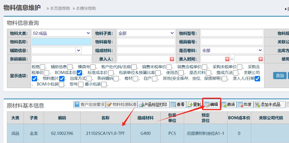 進(jìn)入界面后,選擇對應(yīng)的物料,點擊編輯