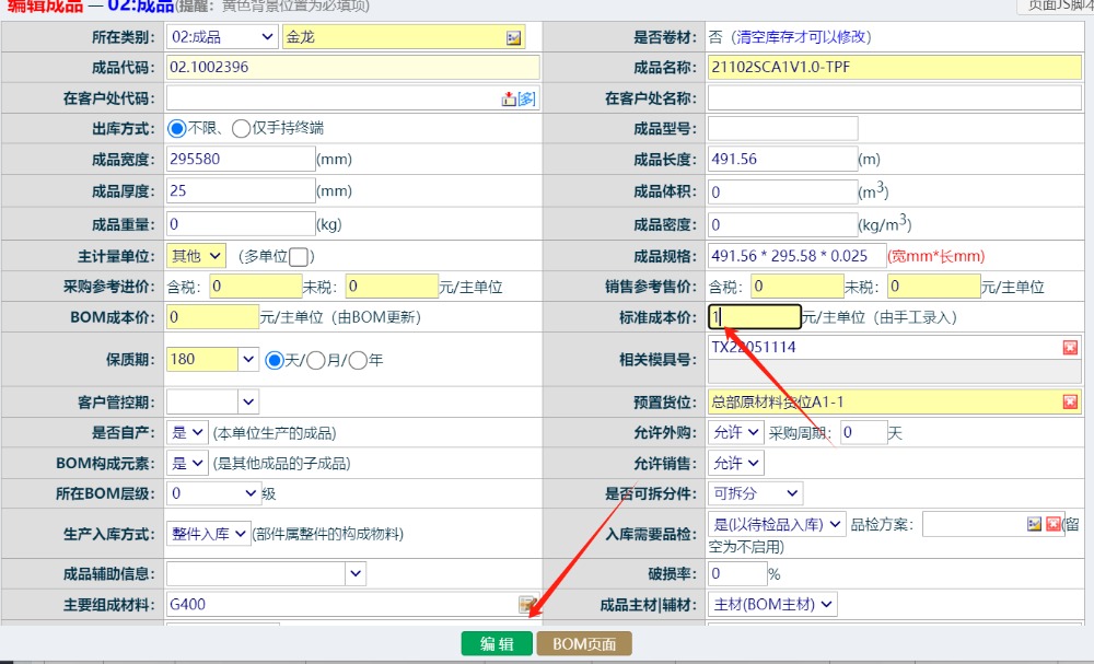 填入標(biāo)準(zhǔn)成本,點擊編輯按鈕完成,如下圖:(注意:若成本需要按生產(chǎn)數(shù)量平攤,則成本價統(tǒng)一默認(rèn)填為1,否則填入真實的標(biāo)準(zhǔn)成本即可)