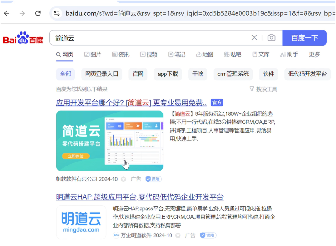 互聯(lián)網營銷沒有秘密! 年營收14億+的帆軟,95%的商機線索是市場部帶來的,而且不虧錢做營銷,很多公司都很羨慕吧?那帆軟線上獲客都用了哪些方法?今天通過公開數據,給大家拆解他們低代碼產品簡道云線上營銷怎么做。 快速了解內容,點擊下方短視頻? 01 搜索引擎廣告 以我十幾年實戰(zhàn)經驗,到一定收入規(guī)模的公司很少不投搜索廣告的。帆軟也不例外,搜索廣告投放上,通過百度搜索簡道云和零代碼對應關鍵詞,看到競價排名都在投,搜索非品牌詞的時候有專門的營銷落地頁,可以促進流量轉化。