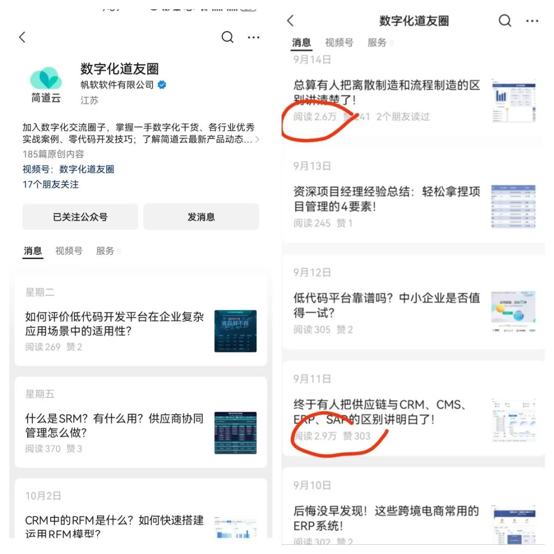 03 新媒體營銷 在新媒體營銷上,簡道云的微信公眾號除了品牌號,還有兩個營銷號,可以借助公眾號推薦流量獲得客戶。日常文章閱讀量在幾百,但是獲得推薦和高轉發(fā)文章閱讀量能過萬,能帶來還算可觀的線索。