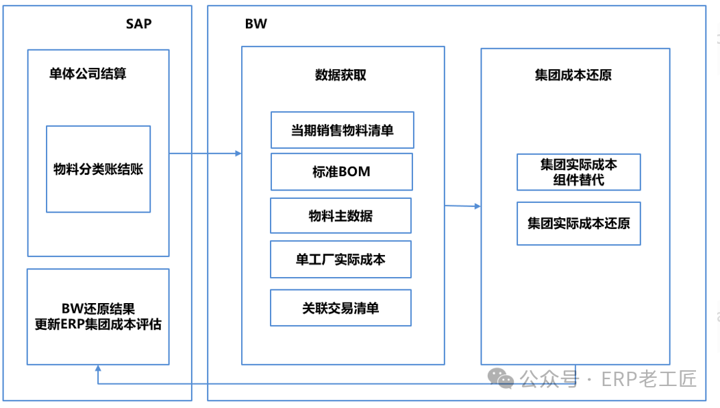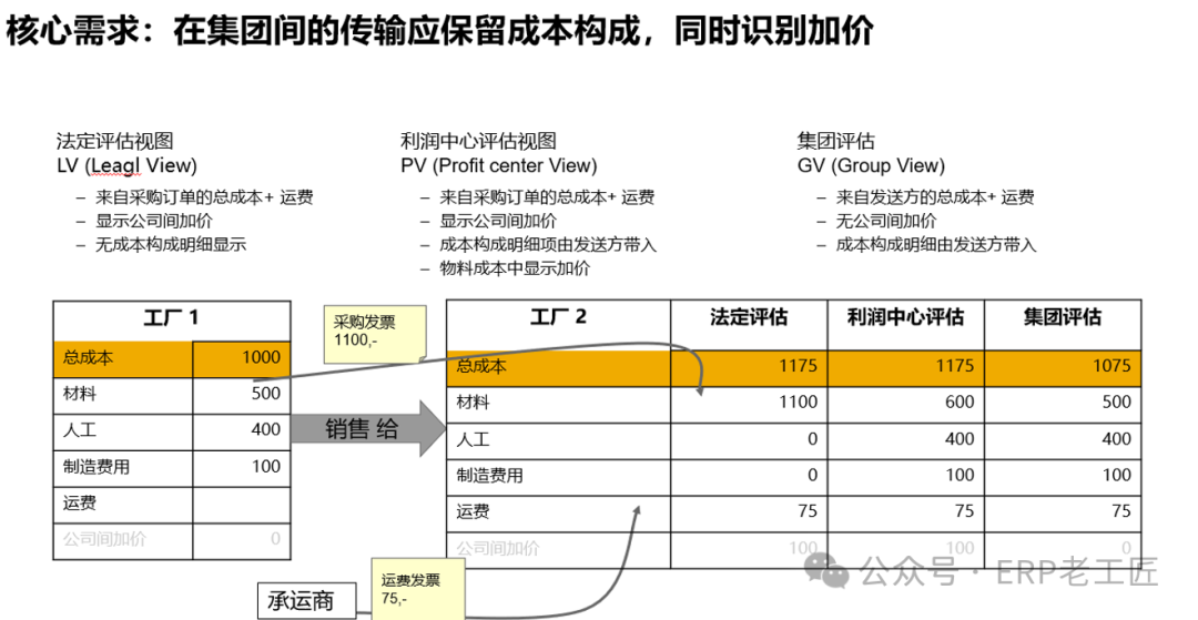 概述:什么是成本還原, 為什么SAP項(xiàng)目中成本還原成為難點(diǎn),成本還原在管理會(huì)計(jì)中的意義是什么? 成本還原(Cost Recovery),就是將產(chǎn)成品耗用各步驟半成品的綜合成本,逐步分解還原為原來(lái)的成本項(xiàng)目。成本還原的方法是從最后步驟開(kāi)始,將其耗用上步驟半成品的綜合成本逐步分解,還原為原來(lái)的成本項(xiàng)目。 1.在業(yè)財(cái)一體化條件下,結(jié)賬采用“綜合結(jié)轉(zhuǎn)”法,即上步驟的產(chǎn)品,是以綜合成本總數(shù)結(jié)轉(zhuǎn)到下步驟的,SAP的集成的實(shí)時(shí)過(guò)賬,更加加劇了這個(gè)特點(diǎn)。 2.SAP系統(tǒng)計(jì)算實(shí)際成本的邏輯:實(shí)際成本=標(biāo)準(zhǔn)成本+差異,實(shí)際成本由標(biāo)準(zhǔn)成本及多筆差異結(jié)轉(zhuǎn)而來(lái),因此要實(shí)現(xiàn)完成的成本還原,必然對(duì)業(yè)務(wù)端操作有限制與要求. 3.特別是在集團(tuán)型企業(yè),跨公司存在著法定“加價(jià)”,增加了成本還原的難度,基于法定維度LV(Legal View)的法定存貨評(píng)估與基于集團(tuán)維度GV(Group View)背離,及大部分企業(yè)的數(shù)據(jù)基礎(chǔ)薄弱,增加了實(shí)現(xiàn)成本還原落地的技術(shù)難度。 成本還原的管理價(jià)值:成本還原是基于集團(tuán)價(jià)值鏈管理角度的概念,因此,對(duì)于整個(gè)集團(tuán)的價(jià)值鏈分析,在預(yù)算管理,行業(yè)對(duì)標(biāo),內(nèi)控分析等具有重要意義: 1)編制預(yù)算:基于集團(tuán)層的預(yù)算,成本結(jié)構(gòu)是重要的基礎(chǔ),比如原材料預(yù)算,輔助料預(yù)算,人工預(yù)算,設(shè)備預(yù)算等,成本還原結(jié)構(gòu)是重要的參考數(shù)據(jù),也是搭建很多BI數(shù)據(jù)分析模型的基礎(chǔ)。 2)行業(yè)對(duì)標(biāo):與同行業(yè)對(duì)比,各種成本結(jié)構(gòu),各種資源消耗水平是否先進(jìn)。法人結(jié)構(gòu)可能由于稅率等原因,各個(gè)公司有不同的設(shè)置,但是從管理的角度,相同的行業(yè)往往需要進(jìn)行對(duì)標(biāo)分析,比如汽車,手機(jī),家電等。 3)全價(jià)值鏈分析,展開(kāi)供應(yīng)鏈合作,只有通過(guò)成本結(jié)構(gòu)分析,發(fā)現(xiàn)價(jià)值有效還是無(wú)效,對(duì)供應(yīng)鏈進(jìn)行整合,比如,對(duì)某些成本高的工序進(jìn)行外包決策等; 4)進(jìn)行區(qū)域,行業(yè)等維度的戰(zhàn)略分析:解析成本結(jié)構(gòu),區(qū)分交易加價(jià),將集團(tuán),產(chǎn)品線,法定三個(gè)維度區(qū)分,區(qū)分各個(gè)產(chǎn)品,區(qū)域的獲利能力。 方案總覽:在SAP實(shí)施項(xiàng)目中,成本還原方案,按是否跨公司,基于實(shí)時(shí)交易(OLTP)或基于數(shù)據(jù)分析(OLAP),老工匠總結(jié)了3種解決方案: 方案一:?jiǎn)我还敬a下的成本還原: SAP系統(tǒng)中,激活實(shí)際成本構(gòu)成本,按實(shí)際(成本結(jié)構(gòu))=標(biāo)準(zhǔn)(成本結(jié)構(gòu))+差異(成本結(jié)構(gòu)),可實(shí)現(xiàn)標(biāo)準(zhǔn)成本結(jié)構(gòu)VS實(shí)際成本結(jié)構(gòu),即實(shí)現(xiàn)成本還原: 1.只要激活物料賬的實(shí)際成本結(jié)構(gòu)標(biāo)識(shí),并釋放標(biāo)準(zhǔn)成本,就可以實(shí)現(xiàn)按成本結(jié)構(gòu)的標(biāo)準(zhǔn)VS實(shí)際對(duì)比分析,CKM3N標(biāo)準(zhǔn)功能,如左圖所示; 2.實(shí)際成本結(jié)構(gòu)=標(biāo)準(zhǔn)結(jié)構(gòu)+差異,也就是說(shuō),差異是按結(jié)構(gòu)的。 3.同一個(gè)工廠的,可以用標(biāo)準(zhǔn)功能實(shí)現(xiàn),跨工廠的成本,也可以采用特別采購(gòu)類型實(shí)現(xiàn)跨工廠的成本獲取 跨工廠成本評(píng)估采用配置特別采購(gòu)類型,并將此類型分配到物料主數(shù)據(jù)實(shí)現(xiàn),如下圖: 在同一個(gè)公司代碼下,跨工廠轉(zhuǎn)儲(chǔ)可實(shí)現(xiàn)成本結(jié)構(gòu)的結(jié)轉(zhuǎn),如下圖是301轉(zhuǎn)儲(chǔ)樣例,如下圖: 方案2:跨公司,并采用基于交易憑證法 這就需要激活激活實(shí)際成本結(jié)構(gòu)的同時(shí),物料賬平行評(píng)估(多重評(píng)估),區(qū)分與剔除公司間交易的加價(jià),業(yè)務(wù)場(chǎng)景如下圖所示: 集團(tuán)成本評(píng)估功能使用前提(不完全統(tǒng)計(jì)): 1)集團(tuán)評(píng)估僅限于單一控制范圍下,如涉及到跨公司的成本核算,則關(guān)聯(lián)的公司也應(yīng)該在同一個(gè)控制范圍 2)需要使用集團(tuán)成本評(píng)估的物料主數(shù)據(jù),價(jià)格策略必須是3+S 3)物料主數(shù)據(jù)需要執(zhí)行多重評(píng)估:GV/PV/LV,如標(biāo)估等 4)月末結(jié)賬ML執(zhí)行,需要所有的工廠一起執(zhí)行:系統(tǒng)壓力與風(fēng)險(xiǎn)。 5)工廠間的物料轉(zhuǎn)儲(chǔ)或公司間的物料轉(zhuǎn)儲(chǔ),只能采用采用STO,不能采用PO+SO方式。 6)集團(tuán)內(nèi)委外加工無(wú)法還原 7)系統(tǒng)間的數(shù)據(jù)傳遞僅能通過(guò)ALE或EDI 要充分理解這些條件,包括對(duì)技術(shù)約束及數(shù)據(jù)約束!事實(shí)上,這些約束無(wú)論對(duì)技術(shù),還是對(duì)技術(shù),都是很高的標(biāo)準(zhǔn),大部分的企業(yè)往往不具備這些條件! 平行評(píng)估的配置,請(qǐng)參考5.6講,不在此贅述: 方案2的應(yīng)用分享: 1.事實(shí)上,只有為數(shù)不多的企業(yè)應(yīng)用集團(tuán)評(píng)估,