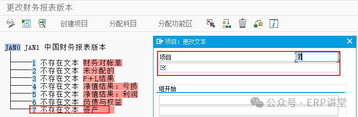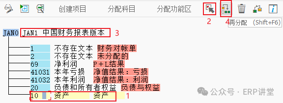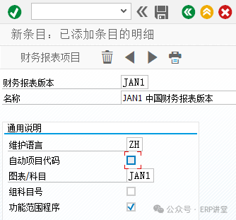 1.創(chuàng)建財(cái)務(wù)報(bào)表版本 IMG-財(cái)務(wù)會(huì)計(jì)-主數(shù)據(jù)-總賬科目-財(cái)務(wù)報(bào)表結(jié)構(gòu)-定義會(huì)計(jì)報(bào)表版本 1.1 新建報(bào)表版本: 點(diǎn)擊“新建條目”創(chuàng)建財(cái)務(wù)報(bào)表版本; 自動(dòng)項(xiàng)目代碼:在編輯報(bào)表版本的時(shí)候,每一行的行項(xiàng)目號(hào)是否可以手工輸入,如果選擇該項(xiàng),則不能手工輸入; 圖表/科目:每一個(gè)財(cái)務(wù)報(bào)表版本必須指定對(duì)應(yīng)的會(huì)計(jì)科目表; 功能范圍程序:如果啟用功能范圍,就必須選擇該功能,表示在編輯報(bào)表版本的時(shí)候,可以根據(jù)功能范圍取得數(shù)據(jù); 1.2維護(hù)報(bào)表版本的表項(xiàng): 點(diǎn)擊“財(cái)務(wù)報(bào)表項(xiàng)目”維護(hù)對(duì)應(yīng)的表項(xiàng); 系統(tǒng)默認(rèn)帶出必須的表項(xiàng) 1.3 修改表項(xiàng)的項(xiàng)目號(hào)和描述 雙擊對(duì)應(yīng)的行,可以更改項(xiàng)目編號(hào)和對(duì)應(yīng)的描述; 1.4 調(diào)整表項(xiàng)的順序 選中需要更改順序的行,點(diǎn)擊“選擇”,再點(diǎn)擊要分配到的行,再點(diǎn)擊“再分配”可以調(diào)整行的順序和分配關(guān)系;