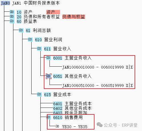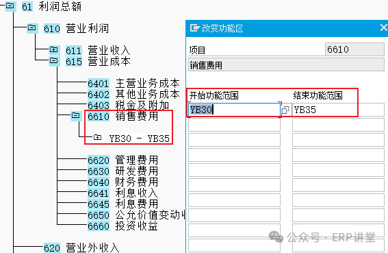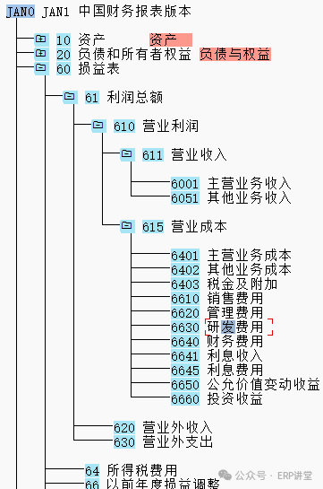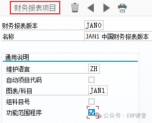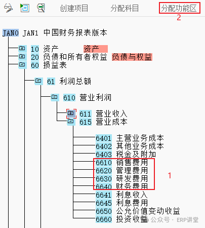 3.利潤(rùn)表的表項(xiàng)維護(hù): 新建的表項(xiàng)需要和公司的利潤(rùn)表表項(xiàng)相同; 如果利潤(rùn)表是通過會(huì)計(jì)科目實(shí)現(xiàn)的,那利潤(rùn)表的每一個(gè)表項(xiàng)對(duì)應(yīng)的都是會(huì)計(jì)科目; 如果利潤(rùn)表是通過功能范圍實(shí)現(xiàn)的,那利潤(rùn)表的每一個(gè)表項(xiàng)對(duì)應(yīng)的都是功能范圍; 例如: 如果通過科目+功能范圍實(shí)現(xiàn),那利潤(rùn)表中部分表項(xiàng)對(duì)應(yīng)了會(huì)計(jì)科目(除期間費(fèi)用外的表項(xiàng)),部分表項(xiàng)對(duì)應(yīng)功能范圍(期間費(fèi)用:管理費(fèi)用,銷售費(fèi)用,財(cái)務(wù)費(fèi)用,研發(fā)費(fèi)用); 如果給表項(xiàng)分配功能范圍,則選擇要分配的表項(xiàng),點(diǎn)擊“分配功能區(qū)” 維護(hù)了功能范圍,則該表項(xiàng)取數(shù)就根據(jù)維護(hù)的功能范圍取對(duì)應(yīng)的余額; 同一個(gè)表項(xiàng)功能范圍和會(huì)計(jì)科目不能同時(shí)維護(hù),只能維護(hù)一種類型;