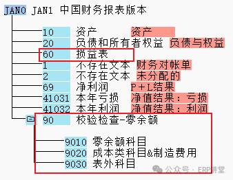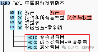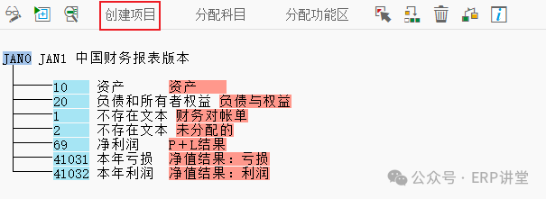 同級(jí):和目標(biāo)行在同一級(jí)別; 附屬級(jí)別:在目標(biāo)行的下一級(jí)別(屬于目標(biāo)行的子項(xiàng)); 1.5 新建表項(xiàng) 點(diǎn)擊“創(chuàng)建項(xiàng)目”可以新建表項(xiàng) 60:損益表(新建損益表表項(xiàng)) 90:校驗(yàn)檢查;檢查表外科目和零余額科目月末的匯總余額是否為0; 零余額科目:固定資產(chǎn)清理,待處理財(cái)產(chǎn)損益; 成本類&制造費(fèi)用:月末生產(chǎn)成本與制造費(fèi)用的匯總余額必須是0; 表外科目:次級(jí)成本要素,GRIR,起初導(dǎo)入科目等;