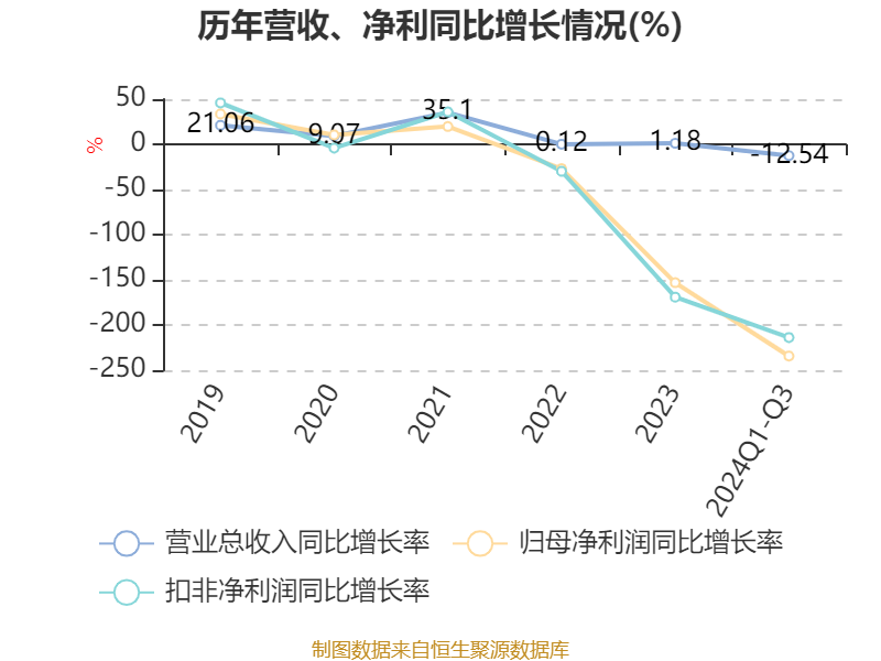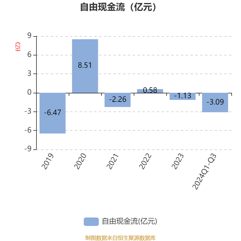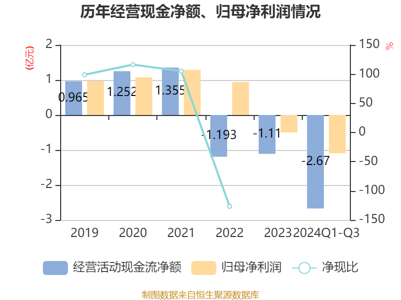 2024年前三季度,公司經營活動現金流凈額為-2.67億元,同比增加3105.79萬元;籌資活動現金流凈額-1.17億元,同比減少8213.42萬元;投資活動現金流凈額264.44萬元,上年同期為-2417.36萬元。
