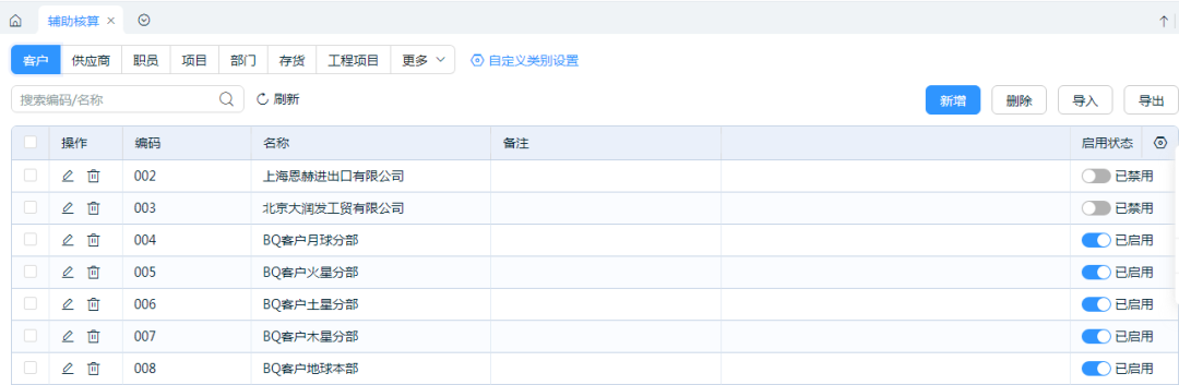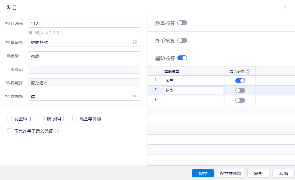 ?輔助核算是對會計科目的一種延伸,旨在實現(xiàn)更廣泛的賬務處理,以適應企業(yè)管理和決策的需要。?通過設(shè)置輔助核算,能夠簡化會計科目體系,減少科目的冗余,提高處理速度和效率。輔助核算具有靈活方便的特性,一個輔助核算項目可以在多個科目下掛接。常見的核算項目包括?客戶、?供應商、部門、?職員、?存貨、項目等。