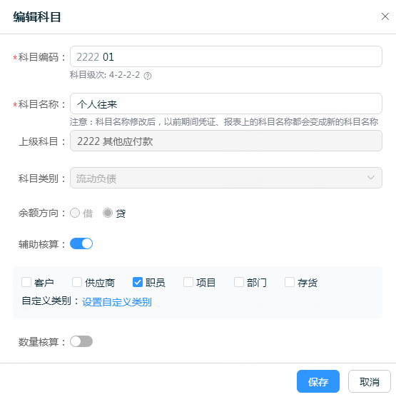 進入軟件后,點擊【設(shè)置】-【科目】,點擊要設(shè)置輔助核算的科目前的修改按鈕,勾選【輔助核算】在選擇適合的輔助核算類別,保存即可??梢远噙x,啟用輔助核算后做憑證選擇明細科目后會有彈窗讓選擇核算項目明細。