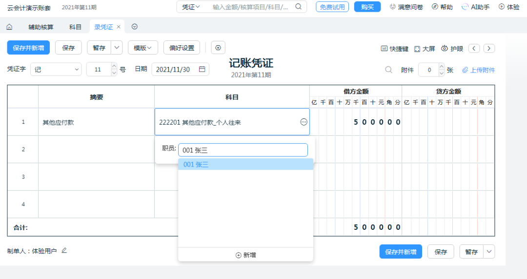 進入軟件后,點擊【基礎(chǔ)資料】-【科目】,點擊要設(shè)置輔助核算的科目代碼,啟用【輔助核算】在選擇適合的輔助核算類別,保存即可??梢远噙x,啟用輔助核算后做憑證選擇明細科目后會有彈窗讓選擇核算項目明細。