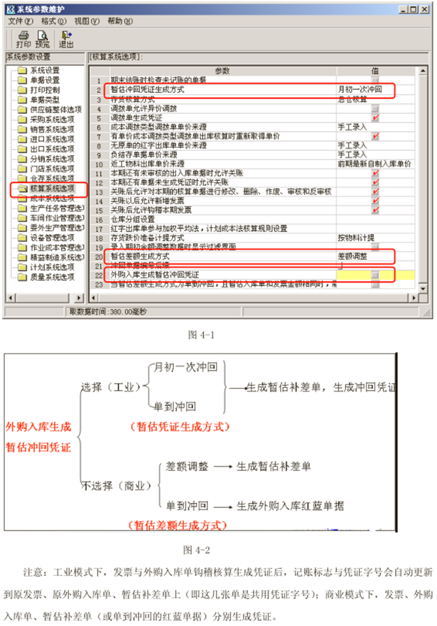 暫估是指本期收到采購的材料錄入外購入庫單后,若月末時未收到發(fā)票賬單等結(jié)賬憑證,對材料的價格進行暫估并入賬。在下期或收到發(fā)票時,要對之前的暫估做沖回處理,可根據(jù)系統(tǒng)參數(shù)的設(shè)置,選擇適合企業(yè)的暫估沖回方式。對于暫估的處理主要分為工業(yè)和商業(yè)的兩種處理方式。如果在【系統(tǒng)參數(shù)】的“核算系統(tǒng)選項”中勾選“外購入庫生成暫估沖回憑證”,則為工業(yè)模式,此時參數(shù)“暫估沖回憑證生成方式”有效,并且提供“月初一次沖回”和“單到?jīng)_回”兩種處理方式;如果在【參數(shù)系統(tǒng)】的“核算系統(tǒng)選項”中沒有勾選“外購入庫生成暫估沖回憑證”,則為商業(yè)模式,此時參數(shù)“暫估差額生成方式”有效,并且提供“差額調(diào)整”和“單到?jīng)_回”兩種處理方式。如圖4-1、圖4-2: 外購入庫生成憑證 一、外購入庫需要生成暫估沖回憑證 當(dāng)系統(tǒng)參數(shù)確認外購入庫需要生成暫估沖回憑證時,對于事務(wù)類型外購入庫,生成憑證的過濾條件,同外購入庫序時簿的過濾條件,可根據(jù)不同的過濾條件選擇不同的憑證模板生成不同業(yè)務(wù)類型的憑證。 根據(jù)業(yè)務(wù),分以下幾種情況說明: 1.外購入庫單和發(fā)票、費用發(fā)票同期到達,且入庫單未生成暫估憑證: 外購入庫單和發(fā)票、費用發(fā)票在核算后一起在外購入庫生成憑證處生成憑證,該憑證為外購入庫單、費用發(fā)票、采購發(fā)票三種單據(jù)的憑證; 2.外購入庫單和采購發(fā)票同期到達,且入庫單未生成暫估憑證,但費用發(fā)票為以后期間到達: 外購入庫單和發(fā)票在核算后一起在外購入庫生成憑證處生成憑證,該憑證為外購入庫單、采購發(fā)票的憑證;費用發(fā)票在補充鉤稽后生成入庫成本調(diào)整單,然后在費用發(fā)票補充鉤稽處,費用發(fā)票和入庫成本調(diào)整單一起生成憑證。 注意:費用發(fā)票補充鉤稽生成憑證是按照鉤稽關(guān)系生成憑證,只能成組生成,不能按單生成,同一鉤稽組憑證字相同,要想按單生成憑證,需要選擇不生成沖回憑證模式! 3.發(fā)票前期到達,外購入庫單后期到達 發(fā)票前期到達,需要等外購入庫單到達后再鉤稽,然后生成憑證,其處理和第一、二種情況一樣處理。 4.外購入庫單和采購發(fā)票同期到達,但入庫單已生成暫估憑證 如果外購入庫單先生成暫估憑證,在和發(fā)票鉤稽核算后不判斷單據(jù)的沖回方式,會統(tǒng)一生成暫估沖回憑證,再和采購發(fā)票一起在外購入庫生成憑證處生成憑證,該憑證為外購入庫單、采購發(fā)票的憑證;費用發(fā)票同期到達鉤稽也會一起生成憑證,費用發(fā)票后期到達則在補充鉤稽后生成入庫成本調(diào)整單,然后在費用發(fā)票補充鉤稽處,費用發(fā)票和入庫成本調(diào)整單一起生成憑證。 5.外購入庫單前期到達,發(fā)票后期到達,且外購入庫單為啟用期以前錄入的單據(jù)或者結(jié)轉(zhuǎn)新賬套后為啟用期以前的單據(jù) 外購入庫單先生成暫估憑證,在和發(fā)票鉤稽核算后,需要先生成暫估沖回憑證,再和采購發(fā)票一起在外購入庫生成憑證處生成憑證,該憑證為外購入庫單、采購發(fā)票的憑證;費用發(fā)票同期到達鉤稽也會一起生成憑證,費用發(fā)票后期到達則在補充鉤稽后生成入庫成本調(diào)整單,然后在費用發(fā)票補充鉤稽處,費用發(fā)票和入庫成本調(diào)整單一起生成憑證。 6.外購入庫單前期到達,發(fā)票后期到達 外購入庫單先生成暫估憑證,在和發(fā)票鉤稽核算后,如果沖回方式為月初一次沖回,則不需要生成暫估沖回憑證,直接和采購發(fā)票一起在外購入庫生成憑證處生成憑證,該憑證為外購入庫單、采購發(fā)票的憑證;如果沖回方式為單到?jīng)_回,則需要先生成暫估沖回憑證,再和采購發(fā)票一起在外購入庫生成憑證處生成憑證,該憑證為外購入庫單、采購發(fā)票的憑證;費用發(fā)票同期到達鉤稽也會一起生成憑證,費用發(fā)票后期到達則在補充鉤稽后生成入庫成本調(diào)整單,然后在費用發(fā)票補充鉤稽處,費用發(fā)票和入庫成本調(diào)整單一起生成憑證。 外購入庫生成憑證是針對已審核的采購發(fā)票生成憑證,生成憑證時,系統(tǒng)將已建立鉤稽關(guān)系的采購發(fā)票、外購入庫單、費用發(fā)票作為一組一起生成憑證,在生成憑證時,會將憑證這字號傳到其它應(yīng)付單上(在外購入庫核算時已將費用發(fā)票傳到應(yīng)付系統(tǒng)的其它應(yīng)付單)。 二、外購入庫不需要生成暫估沖回憑證 當(dāng)系統(tǒng)參數(shù)確認外購入庫需要生成暫估沖回憑證時,根據(jù)不同的業(yè)務(wù),分以下幾種情況說明: 1.外購入庫單、采購發(fā)票、費用發(fā)票同期到達,且采購發(fā)票在費用分配前未生成憑證; 外購入庫單、費用發(fā)票、采購發(fā)票分別單獨生成憑證即可,但需要注意使用材料采購科目,避免物料和應(yīng)付賬款的重復(fù)。 2.外購入庫單先到,采購發(fā)票在費用分配前未生成憑證; 外購入庫單、費用發(fā)票、采購發(fā)票分別單獨生成憑證即可,但需要注意使用材料采購科目,避免物料和應(yīng)付賬款的重復(fù)。 3.外購入庫單比發(fā)票先到,或者與采購發(fā)票同期到達,但采購發(fā)票在費用分配